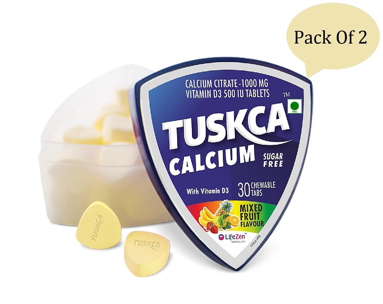 Tuskca is a calcium supplement with added benefits of Vitamin D3. They are tasty, sugar-free chewable calcium tablets that contain a unique calcium citrate formula that has double the absorption compared to other calcium carbonate and calcium phosphate supplements. Tuskca can be taken at any time of the day, with or without food, and does not contribute to kidney stones. Tuskca Calcium sugar-free tablet is available in two delectable flavours like orange and mixed-fruit, which are safe for diabetics too.